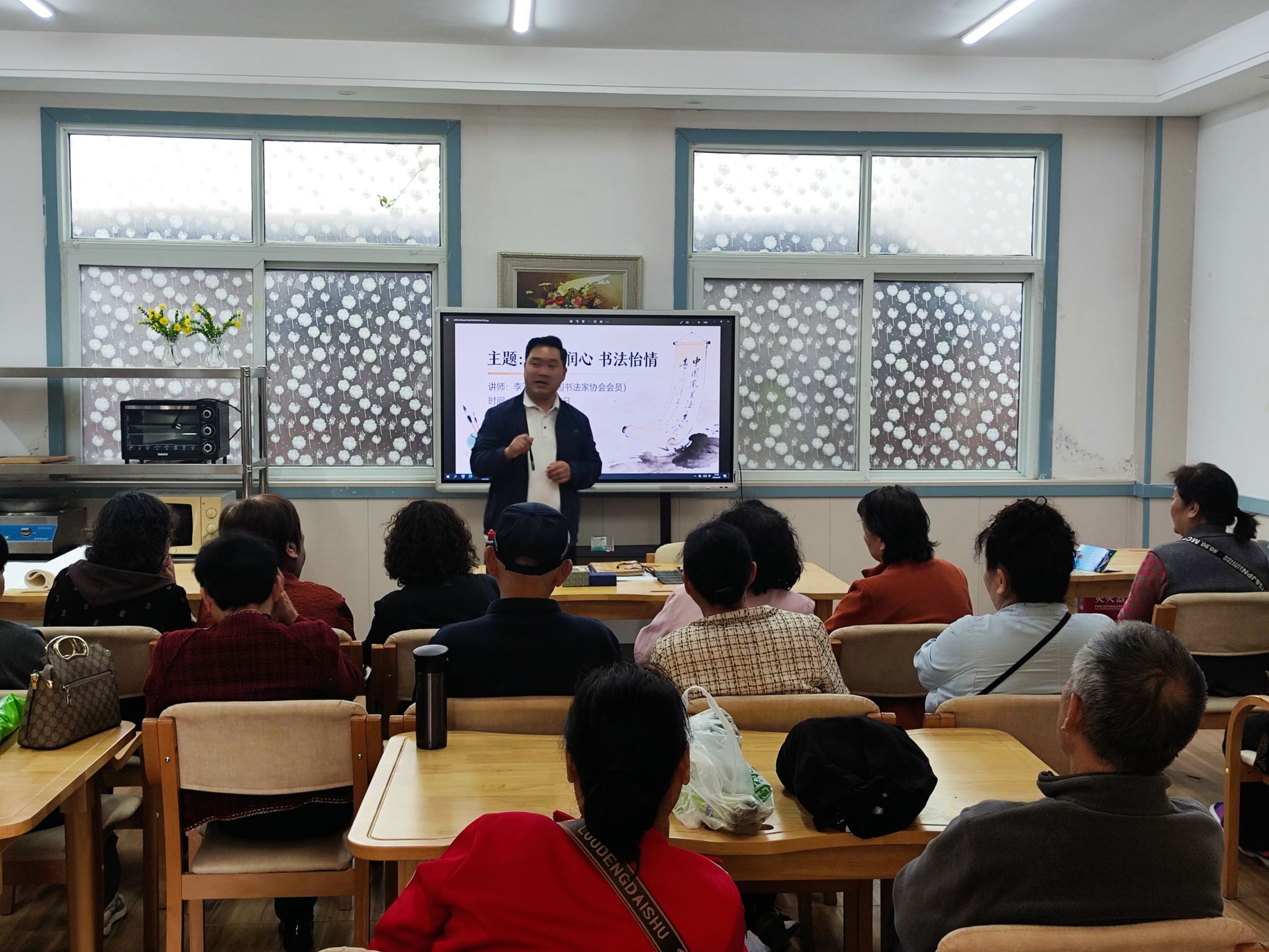 活动伊始,李老师便开启了一场深入浅出的书法知识讲解。他先从最基础的握笔姿势讲起,耐心细致地示范并纠正每一位居民的姿势,确保大家都能掌握正确的握笔要领。接着,李老师深入讲解运笔技巧,结合不同字体的特点,剖析每一笔画的起笔、行笔和收笔,让居民们对书法艺术有了更为系统的认识。对于居民们在日常练习中常常遇到的困惑和问题,李老师更是逐一耐心解答。
